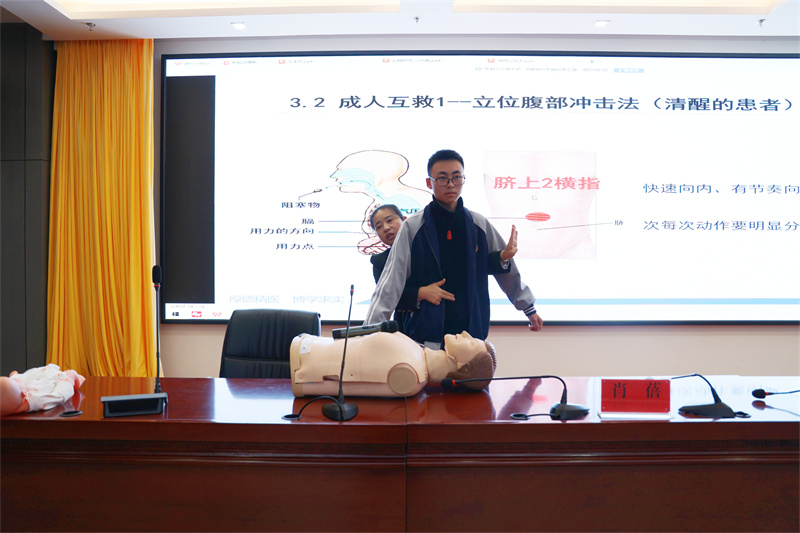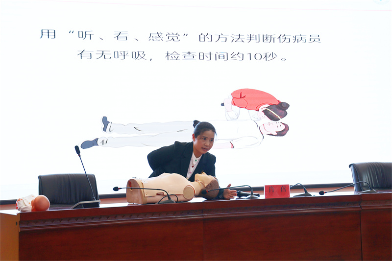 本次培訓(xùn)采用“理論精講+實操演練”的模式,以心肺復(fù)蘇(CPR)、自動體外除顫器(AED)使用要點、海姆利克急救法為核心,深度解讀了“黃金四分鐘”等關(guān)鍵急救理念,幫助學(xué)生快速建立系統(tǒng)、科學(xué)的急救認(rèn)知框架。主講人借助模擬人體模型,全程示范心肺復(fù)蘇完整操作流程,每一個關(guān)鍵動作均拆解講解、反復(fù)示范,確保要點清晰易懂、操作標(biāo)準(zhǔn)可辨。