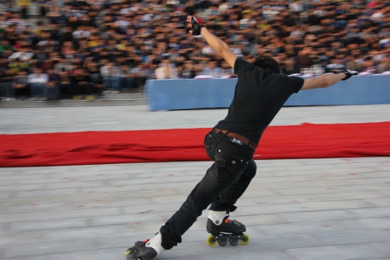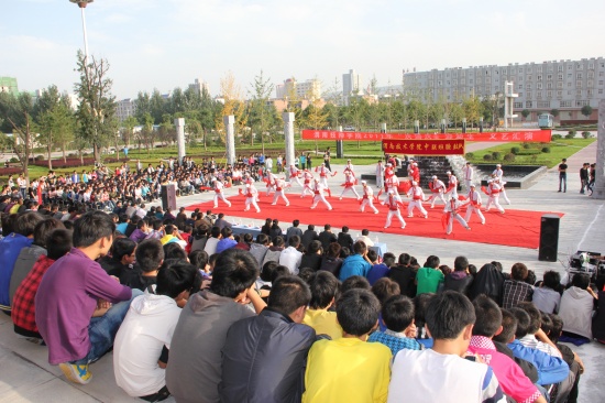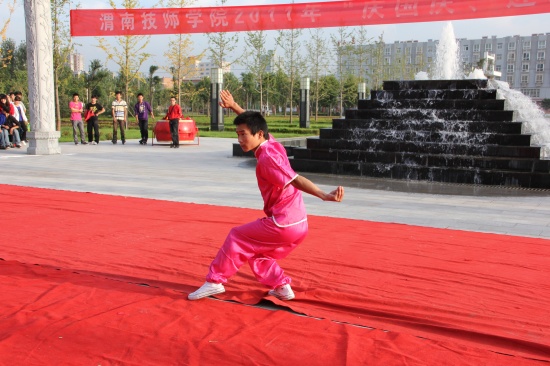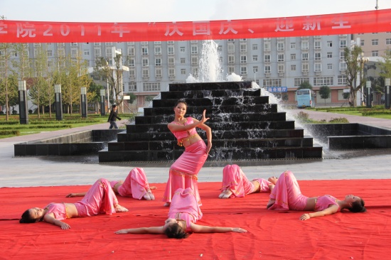 院黨委副書記李東旺致開幕詞 匯演在鏗鏘激昂的陜北腰鼓《喜慶》中盛裝開幕。腰鼓隊(duì)員們抖動(dòng)的紅綢像艷麗的火炬,雄渾的鼓點(diǎn),擊出了昂揚(yáng)的風(fēng)貌、粗獷的舞姿、蓬勃的生命,讓在場(chǎng)所有師生的激情在心中奔涌成河!獨(dú)唱《多情的土地》、《我是一只小小鳥》、《Nothing's gona change my love for you》及組合唱《扯》亦或唯美悅耳、亦或宛轉(zhuǎn)悠揚(yáng)、亦或活力四射,以極強(qiáng)的感染力和震撼力吸引了廣大師生;街舞《舞動(dòng)奇跡》動(dòng)感十足、激情飛揚(yáng);手語表演《從頭再來》整齊劃一、意境深遠(yuǎn);花樣跳繩姿態(tài)翩躚,武術(shù)表演剛?cè)岵?jì)、豪邁有力,滑輪表演《穿梭》引領(lǐng)炫酷風(fēng)暴,精彩絕倫;詩歌朗誦《中國夢(mèng)》、《祖國,我為你自豪》、《我的祖國》,獨(dú)唱《精忠報(bào)國》,舞蹈《吉祥謠》、《春曉》、《神奇的九寨》熱情謳歌了在黨的正確領(lǐng)導(dǎo)下中國正朝著復(fù)興的道路闊步前進(jìn),表達(dá)了全院師生對(duì)偉大祖國的深情祝福和由衷贊美,展示了學(xué)院學(xué)子斗志昂揚(yáng)、奮發(fā)有為、蓬勃向上的良好精神風(fēng)貌。舞蹈《祖國萬歲》將這場(chǎng)演出推向高潮,為整場(chǎng)演出劃上了圓滿的句號(hào)。