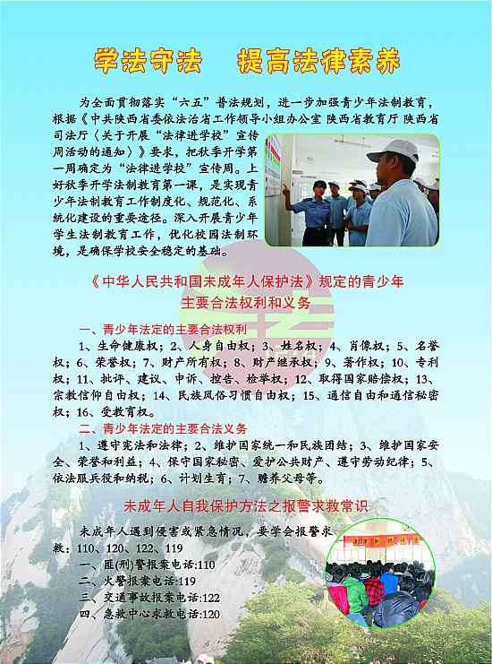 為切實(shí)做好“法律進(jìn)學(xué)!毙麄鞴ぷ,使學(xué)生學(xué)法、守法、懂法,提高法律素養(yǎng)。我院印制并向?qū)W生分發(fā)了法制宣傳彩頁(yè)。根據(jù)青年學(xué)生年齡特點(diǎn)和我院學(xué)生管理的實(shí)際情況,有針對(duì)性地選擇了《中華人民共和國(guó)未成年人保護(hù)法》規(guī)定的青少年主要合法權(quán)利和義務(wù)、未成年人自我保護(hù)方法之報(bào)警求救常識(shí)和《中華人民共和國(guó)預(yù)防未成年人犯罪法》的相關(guān)知識(shí),對(duì)學(xué)生進(jìn)行宣傳,進(jìn)一步提高了學(xué)生的法律意識(shí)。