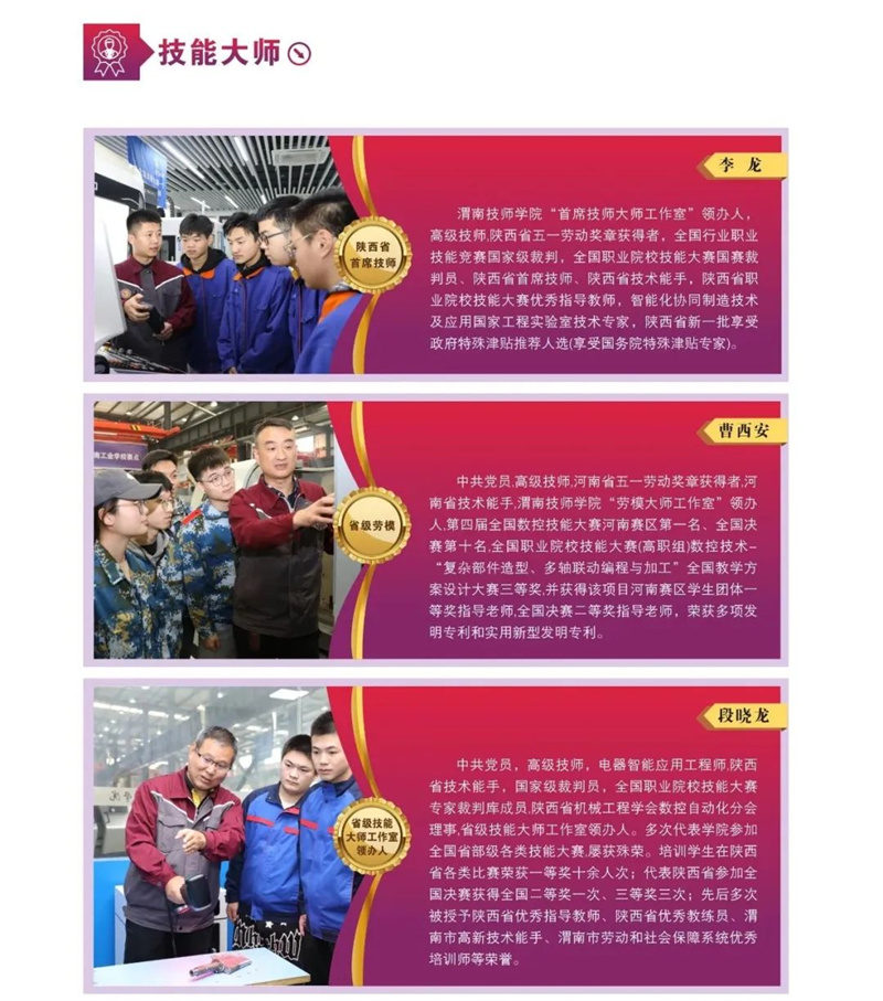 02 深耕教壇,探索新路:激發(fā)教育活力擘畫發(fā)展新篇 全面推進(jìn)提質(zhì)強(qiáng)!鞍舜蠊こ獭薄⒔虒W(xué)“六抓六促”專項(xiàng)行動(dòng)、“五個(gè)一、四評(píng)議”等活動(dòng),錨定“質(zhì)量立校、人才強(qiáng)校、特色興校、提質(zhì)強(qiáng)!敝涡7铰,教育教學(xué)質(zhì)量穩(wěn)步提升。成立渭南市產(chǎn)業(yè)人才發(fā)展院。研究生學(xué)歷以上教師人數(shù)突破百名,提前完成人才強(qiáng)校“雙百人才”計(jì)劃。實(shí)施一體化專業(yè)建設(shè),制定《一體化課程教學(xué)改革方案實(shí)施規(guī)劃》等制度,數(shù)控技術(shù)應(yīng)用、機(jī)電一體化、計(jì)算機(jī)網(wǎng)絡(luò)等三個(gè)專業(yè)被人社部確定為全國技工院校工學(xué)一體化試點(diǎn)專業(yè),新建省級(jí)數(shù)控技能大師工作室、省級(jí)首席技師大師工作室、省級(jí)勞模工作室、一體化學(xué)習(xí)工作站50余個(gè)。曹西安非標(biāo)設(shè)計(jì)工匠工作室獲批“中國機(jī)電裝備維修與改造技術(shù)協(xié)會(huì)”2024第一批工匠工作室;段曉龍大師工作室被推薦為2024年國家級(jí)技能大師工作室;李龍獲“陜西省五一勞動(dòng)獎(jiǎng)?wù)隆保槐R星星獲“陜西省首席技師”榮譽(yù)稱號(hào)。積極探索職普融通多元立體培養(yǎng)機(jī)制,我校作為陜西省第一批試點(diǎn)學(xué)校,與渭南中學(xué)聯(lián)合辦學(xué),共同打造綜合高中試點(diǎn)班,形成職普互促、共贏發(fā)展,助力學(xué)生人人成才。