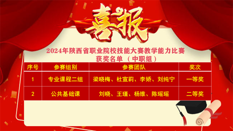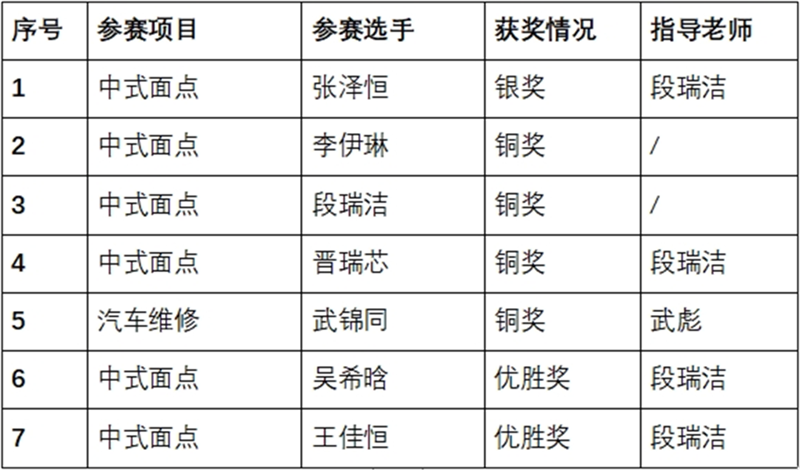04 師生精業(yè),屢獲碩果:榮譽(yù)加身彰顯杰出風(fēng)采 實(shí)施大賽突破、爭(zhēng)先進(jìn)位建設(shè)工程,扎實(shí)推進(jìn)教育教學(xué)工作,堅(jiān)持以賽促學(xué)、以賽促教、以賽促訓(xùn)、以賽促建的發(fā)展理念,在“創(chuàng)新杯”等教科研成果評(píng)選活動(dòng)中,我院教師榮獲省級(jí)一等獎(jiǎng)17人、二等獎(jiǎng)24人、三等獎(jiǎng)2人、陜西省思政課程標(biāo)兵3人、課程思政標(biāo)兵1人。學(xué)院先后舉辦省、市職業(yè)院校技能大賽3次,300余名教師參加省市中職學(xué)校教學(xué)能手、教學(xué)能力比賽等,榮獲國家級(jí)銀獎(jiǎng)3個(gè),銅獎(jiǎng)3個(gè),優(yōu)秀指導(dǎo)教師2人。13名教師入選首批渭南市優(yōu)秀高技能人才。教師發(fā)表SCI 論文1篇,國家級(jí)論文25篇,省級(jí)論文1篇;申請(qǐng)實(shí)用型專利1個(gè),發(fā)明專利1個(gè);主編教材4種,專著6種;省級(jí)課題1個(gè);市級(jí)一等獎(jiǎng)9人、二等獎(jiǎng)7人、三等獎(jiǎng)1人、教學(xué)標(biāo)兵1人。薛海龍同學(xué)在全國裝備制造行業(yè)新技術(shù)應(yīng)用技能競(jìng)賽中榮獲二等獎(jiǎng)。在陜西省教育廳主辦的2024年職業(yè)院校技能大賽賽事中,我校參加16個(gè)賽項(xiàng)的比賽,共獲得一等獎(jiǎng)3個(gè),二等獎(jiǎng)4個(gè),三等獎(jiǎng)5個(gè)。在陜西省人力資源和社會(huì)保障廳主辦的第二屆全國鄉(xiāng)村振興職業(yè)技能大賽陜西省選拔賽中,我校獲“中式面點(diǎn)賽項(xiàng)優(yōu)秀組織獎(jiǎng)”,“中式面點(diǎn)”賽項(xiàng)獲1個(gè)銀獎(jiǎng),3個(gè)銅獎(jiǎng),2個(gè)優(yōu)勝獎(jiǎng),“汽車維修”賽項(xiàng)獲1個(gè)銅獎(jiǎng)。