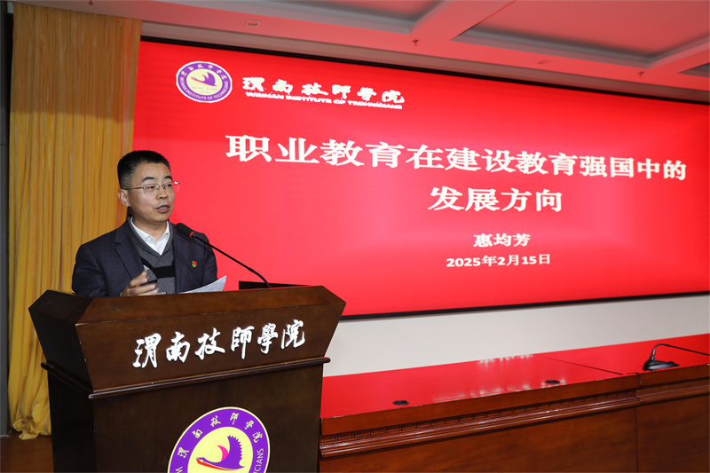 2月15日,陜西省教育科學研究院副院長惠均芳應邀蒞臨我院作題為《職業(yè)教育在建設教育強國中的發(fā)展方向》的專題講座,學院黨委書記曲志勇、領導班子成員、副科以上干部及全體教師參加此次講座。講座由黨委副書記、院長張君升主持。
